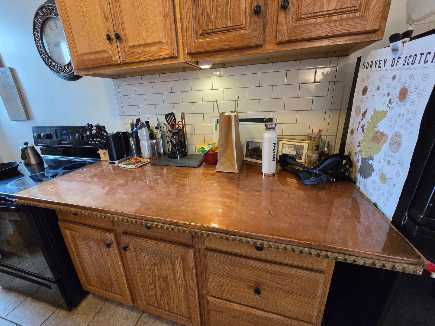 Large living room, kitchen/dining area with beautiful copper countertop.