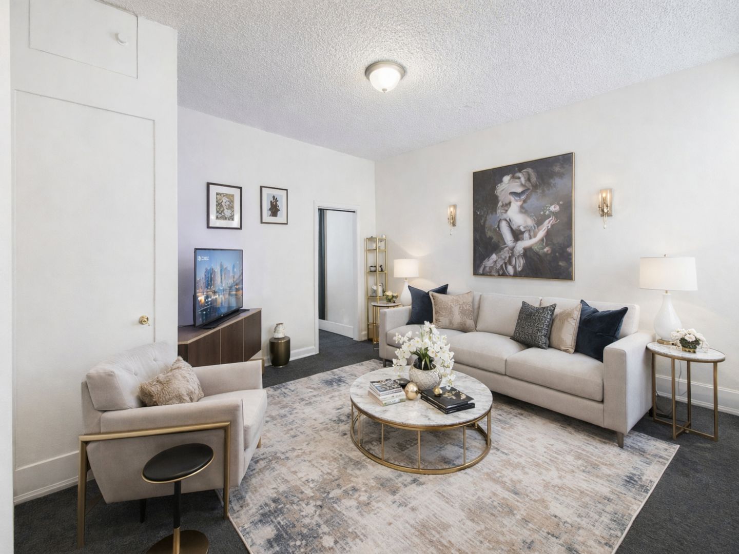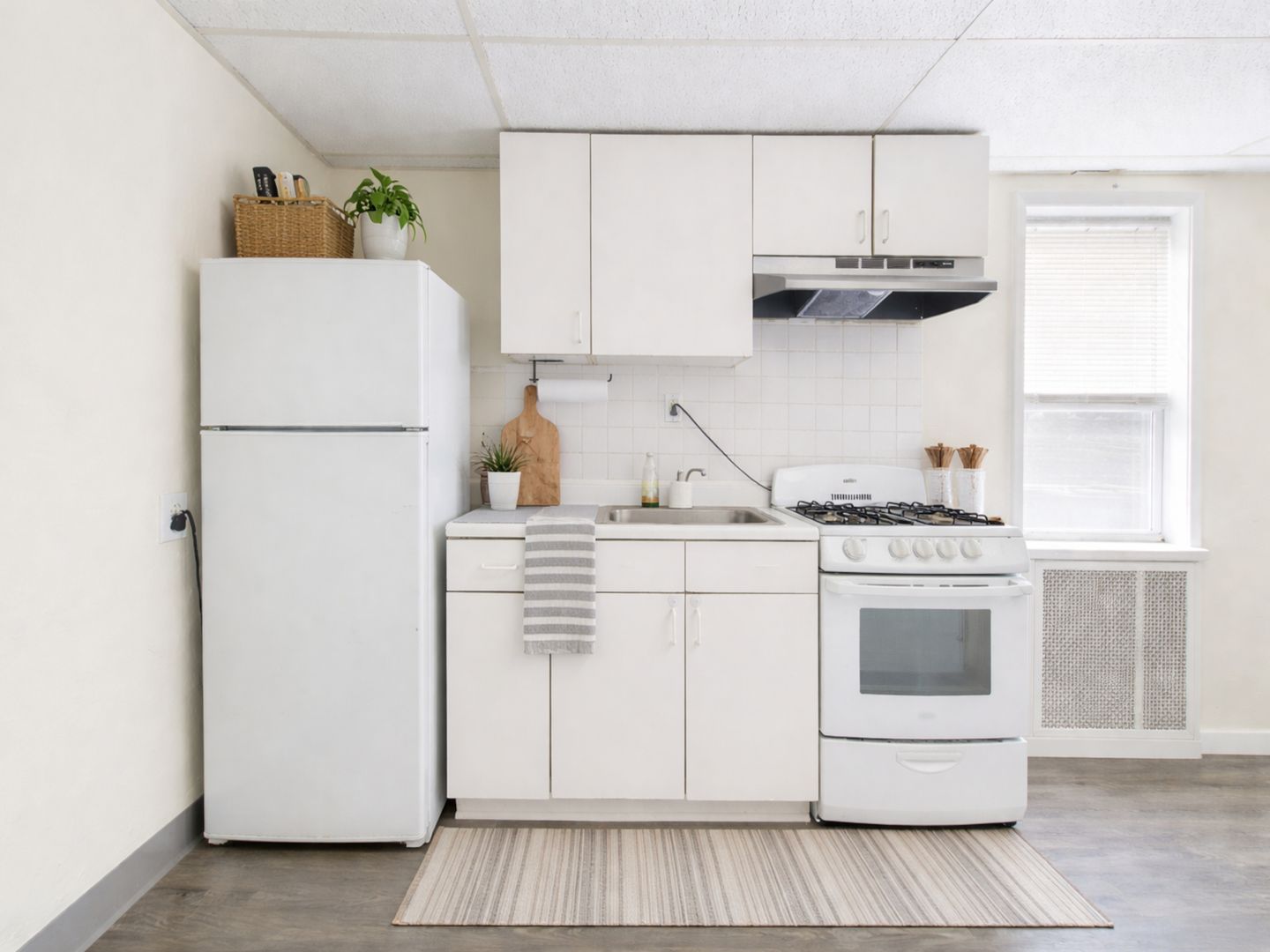The kitchen features clean white cabinetry, a gas range, and ample storage, flowing seamlessly into a dedicated dining area—perfect for everyday living or entertaining. Large windows throughout the unit bring in great natural light, giving the space an open and airy feel.