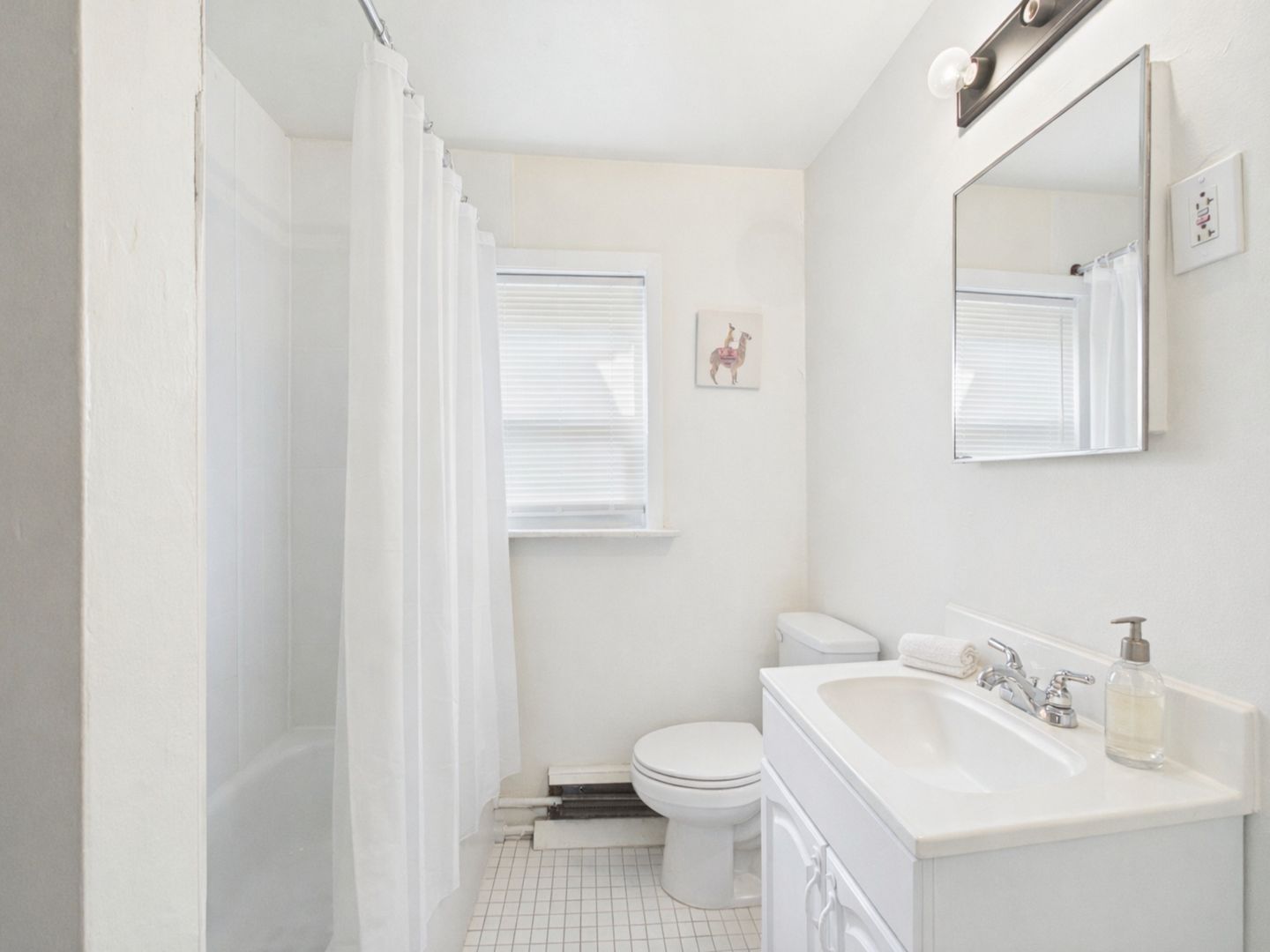 The bedroom is generously sized and easily accommodates a full bedroom setup, while the bathroom is clean and functional with a full tub and updated fixtures.
