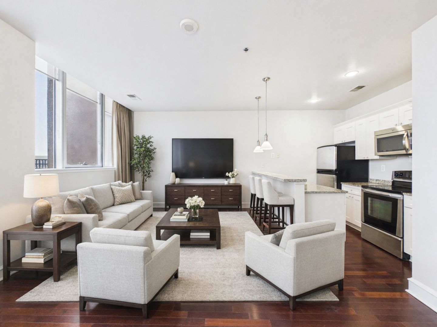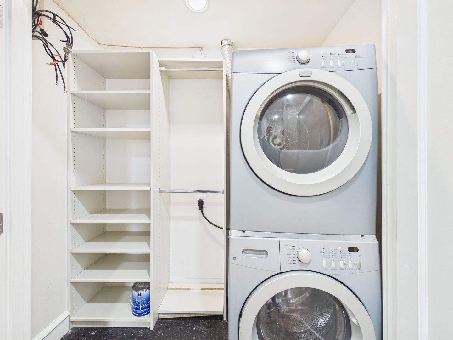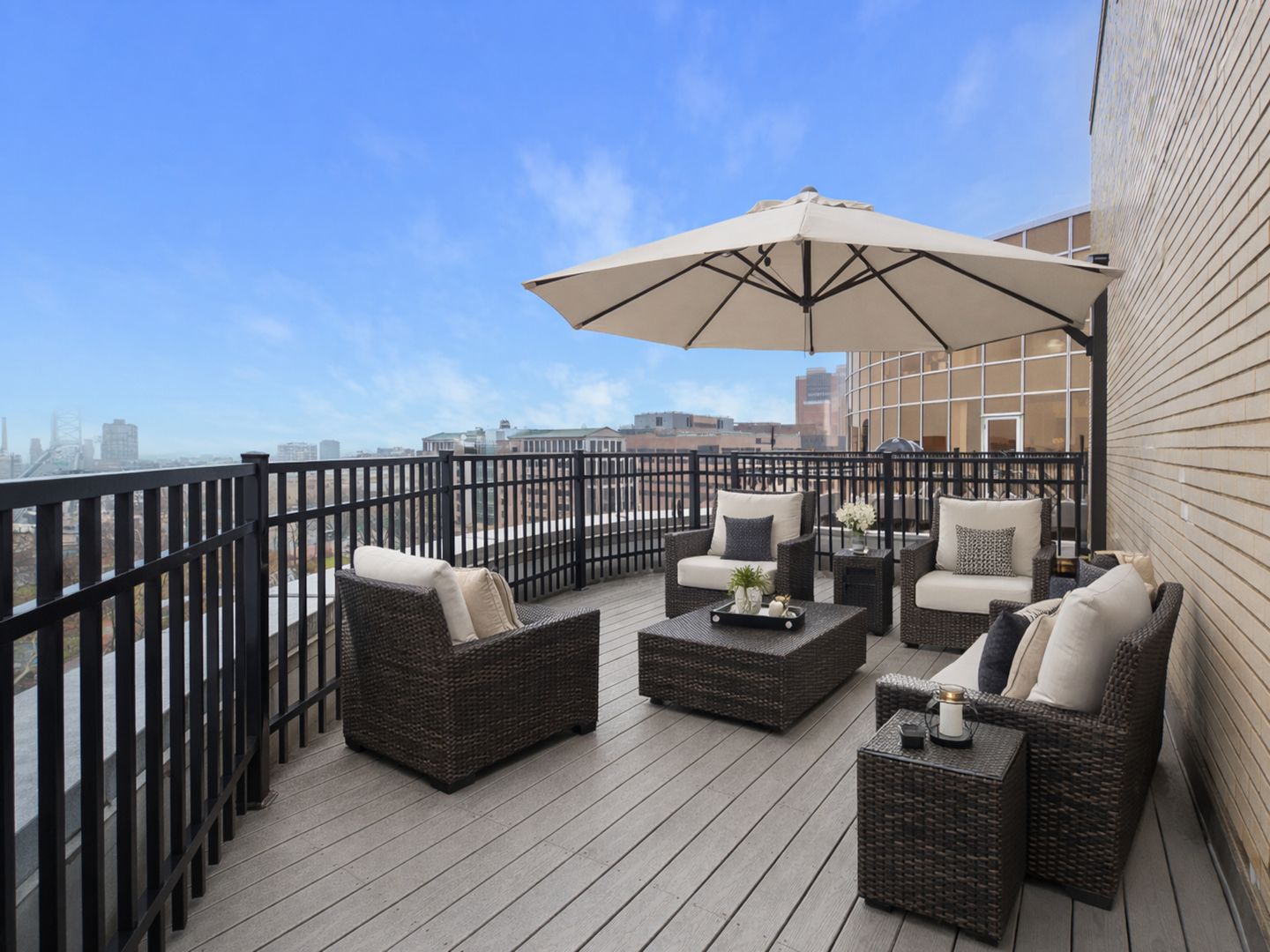 Old City Penthouse 2 story 2 bed 1.5 bath that checks off all the boxes in an elevator high rise building with gated assigned parking space. The first-floor open floor plan offers beautiful hardwood floors, granite kitchen, stainless steel appliances, coat closet, office nook, powder room, and wall of windows and glass door that leads out to the largest deck at the Metro Club with 600 sq ft dimensions. This deck has direct views of the Ben Franklin Bridge and Franklin Square and is ready for your outdoor furniture and decorating. The views of this enormous deck are incredible and especially breathtaking at night and during firework displays. Upstairs are 2 large bedrooms with remote control window treatments and both bedrooms have full views of the Ben Franklin Bridge. One bedroom has a walk-in closet and the other bedroom has a very large closet and direct access to the marble bath. The upstairs hallway is wide enough for furniture and offers another walk-in closet and a laundry area with a front-loading full-size washer and dryer and even more closet space.