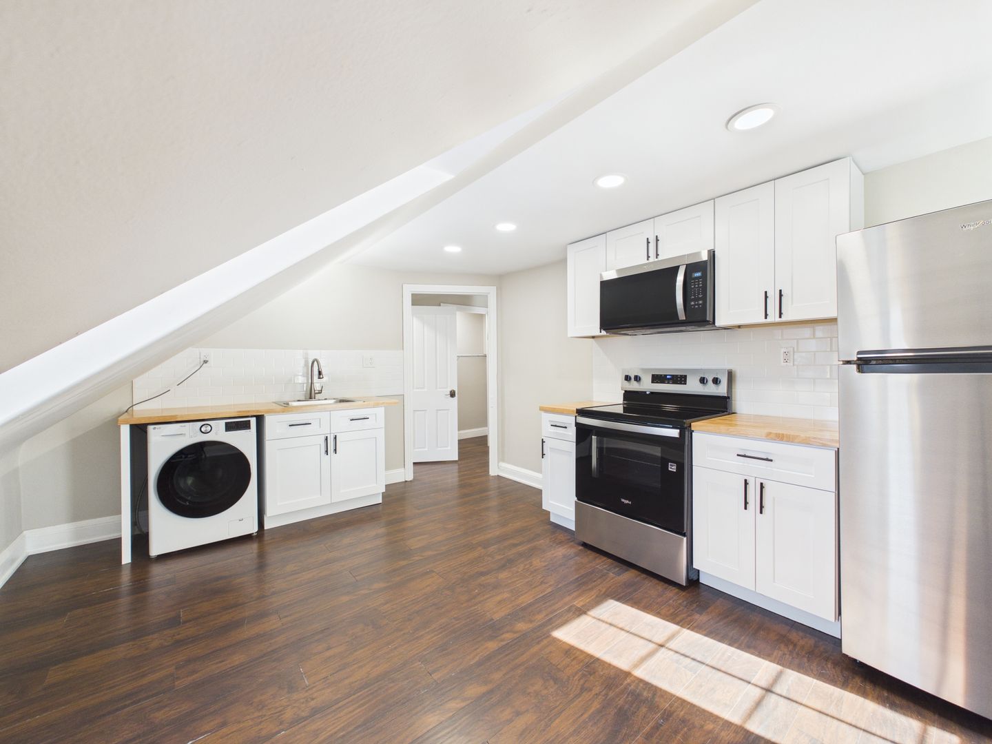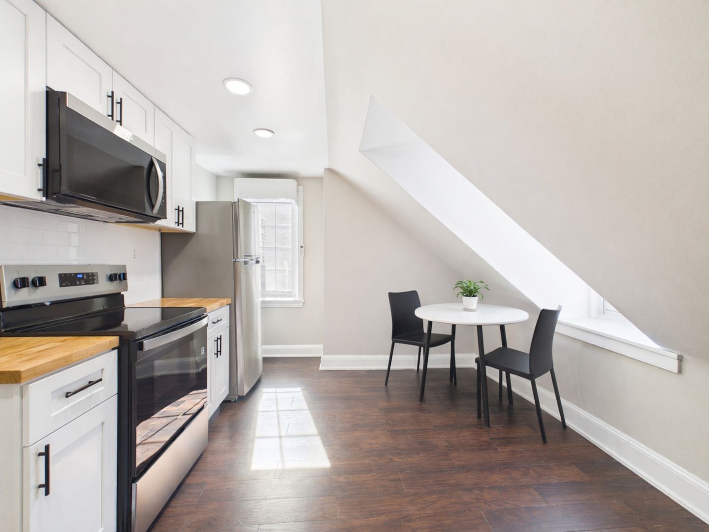 The modern kitchen is equipped with stainless steel appliances, butcher block countertops, and white shaker cabinets, offering both style and functionality. A dedicated dining nook sits perfectly by the window, ideal for everyday meals or working from home.