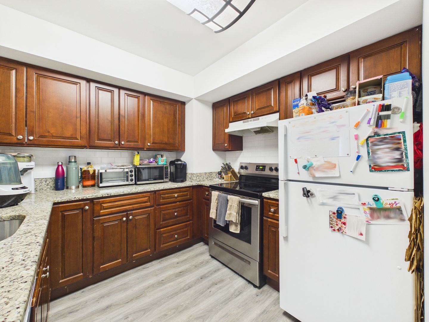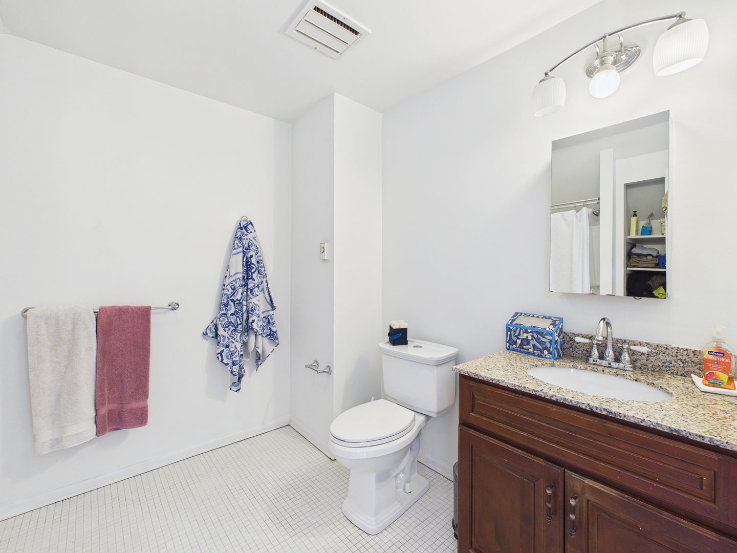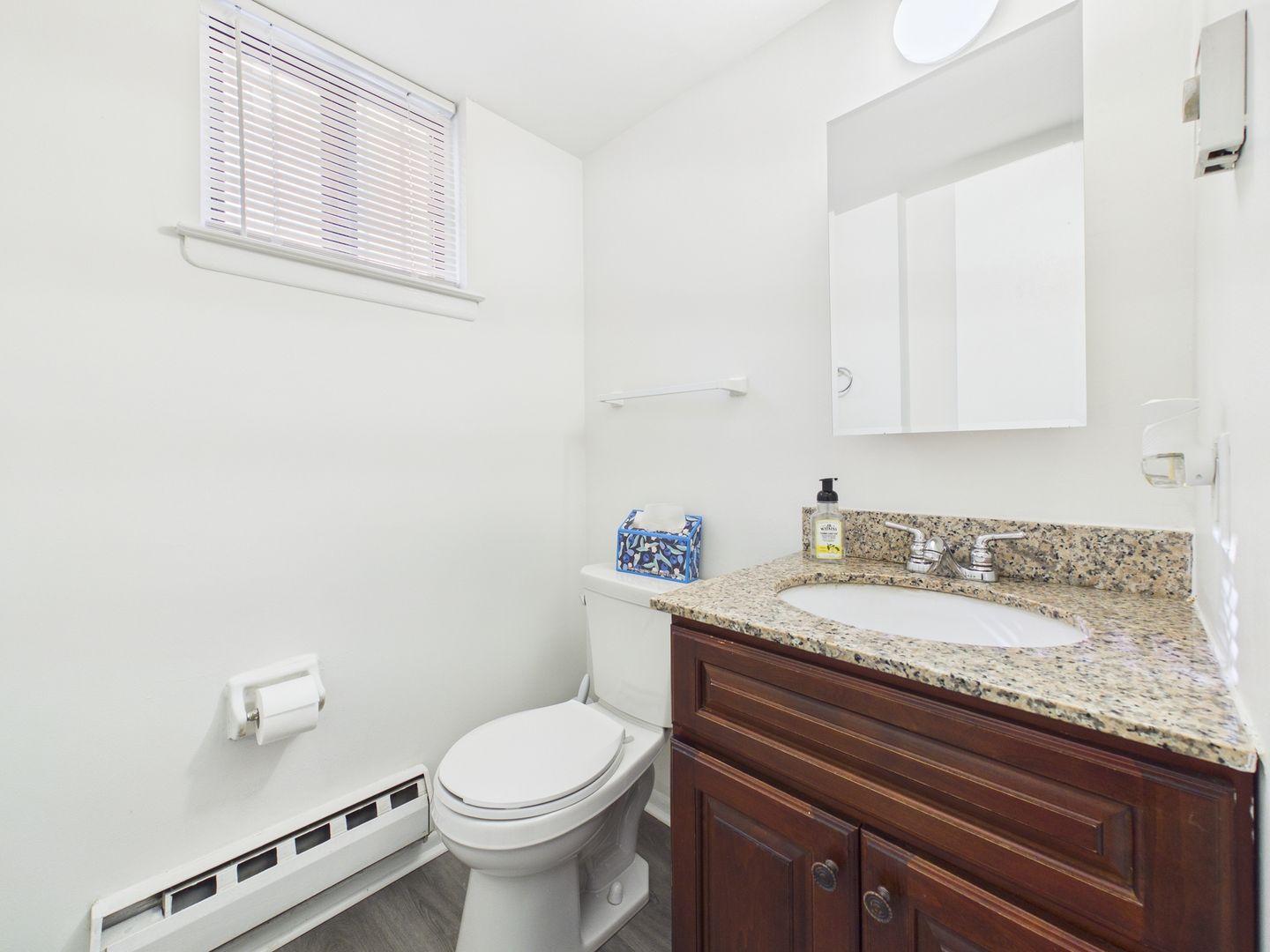 Half a level up from the living room is the new kitchen with with custom made granite counter tops, new cabinetry and an adjacent dining room. The next floor is split level with 2 bedrooms, both with double built in closets, and a full bathroom with new vanity, medicine cabinet etc.